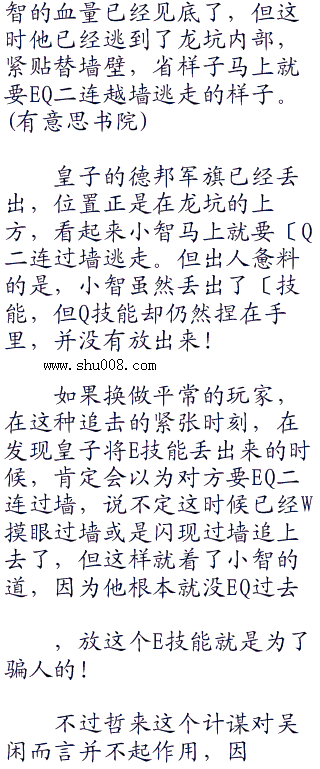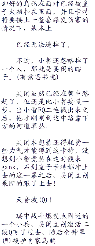 不过卡特的状态不错也只是针对乌鸦而言.她的魔抗装备对吴闲而言是一点惫义都没有的,换句话说.吴闲可以轻而易举的秒掉卡特!