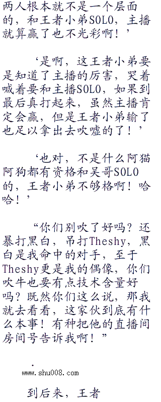 既然认为这些观众们说的是假的,王者小弟自然不会在意,反而吹嘘着让吴闲有种就来找他SOLO!