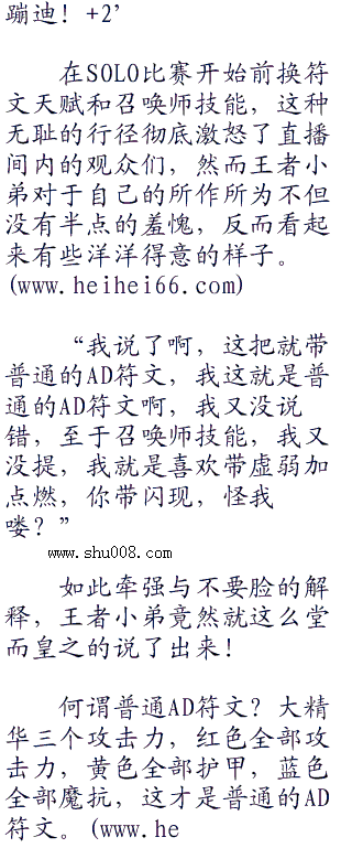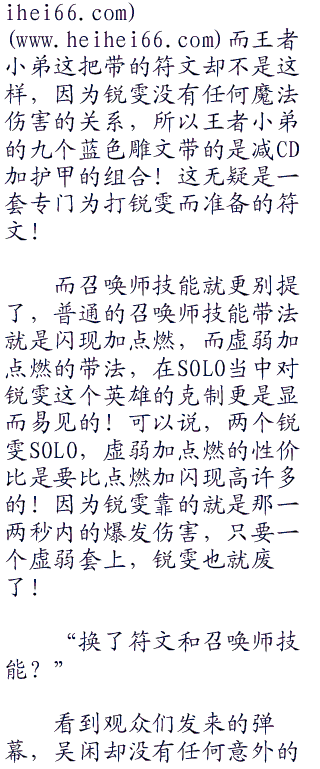 以前吴闲和一干职业选手们SOLO的时候,都是遵循的以上的准则,今天和王者小弟的SOLO,吴闲还没说什么,王者小弟倒是先跳出来对吴闲说了这些,告诉吴闲这把两人都该带普通的AD符文天赋什么的。<a href="hei." target="_blank">hei.</a>