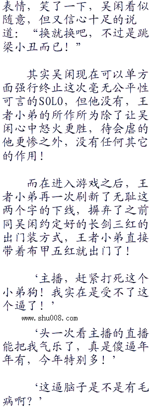 王者小弟装作答应吴闲提出的条件之后,两人的SOLO赛就这么开始了。首发