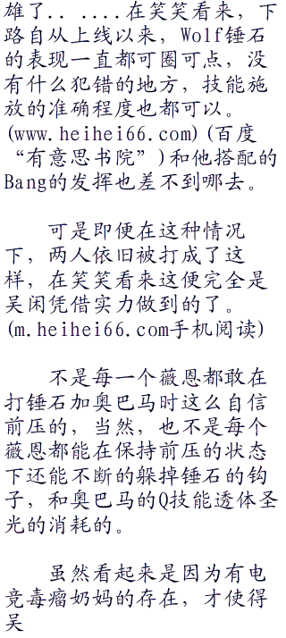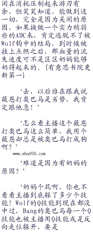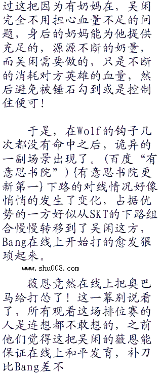 在将W技能的第三段被动伤害打出来之后,吴闲并不恋战,转身便开始安稳的补起兵来,期间Bang的圣枪游侠虽然趁机A了吴闲几下,但随后奶妈两个W技能便将吴闲的血量重又补成了满血。有意思书.院首发