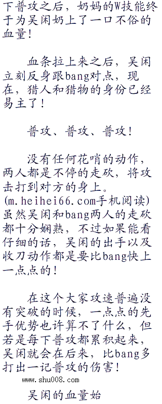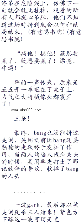 时间一分一秒的过去,吴闲和wolf两人的血量交替下降,很快便来到了濒死的危险线上。有意.思书院首发