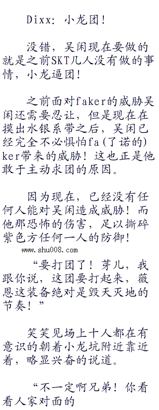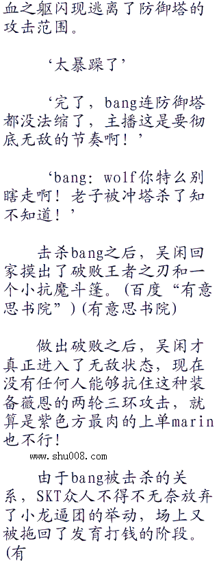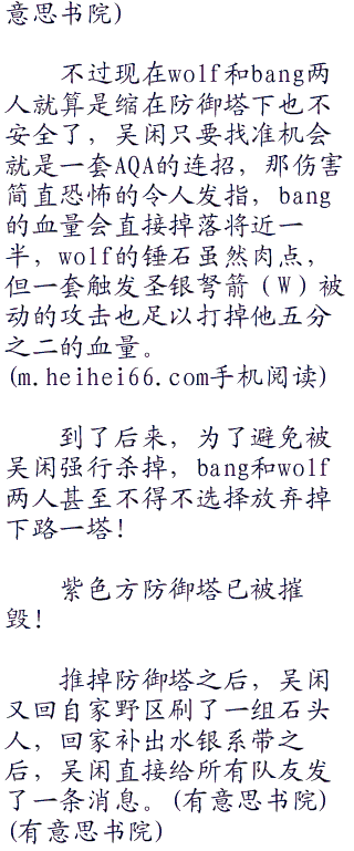 bang和wolf两人现在憋屈的要死,但他们却没有上前找吴闲一战的勇气,之前的两次被击杀已经彻底让他们丧失了和吴闲对抗的勇气,现在只敢萎缩在塔下补兵发育了。