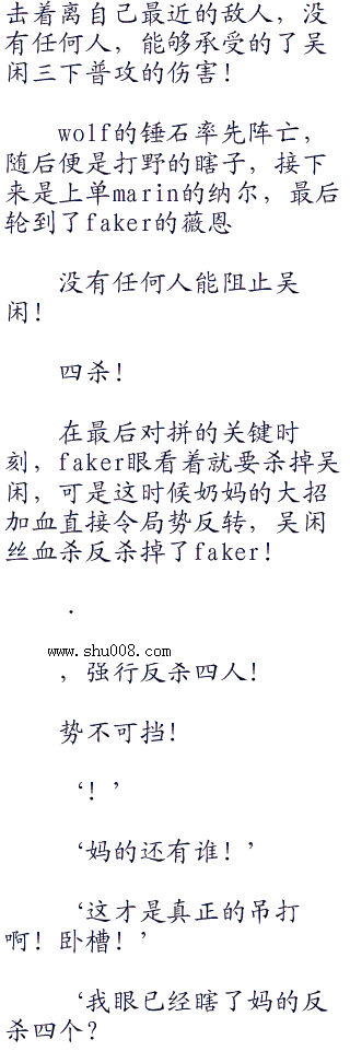 这一波小龙团战之后,便再也没有人能够阻止吴闲的薇恩了。<a href="hei." target="_blank">hei.</a>本来唯一一个对吴闲威胁很大的faker的妖姬,在吴闲又摸出一件幽魂斗篷之后,妖姬的伤害也不足以对他造成什么严重的威胁了。