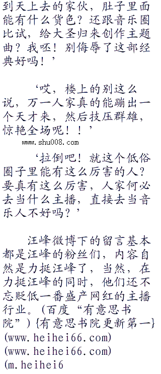 汪峰的这条微博很短,只有两句话,但其中蕴含的内容却一点都不少。先是点出西游记之大圣归来是一部经典的国产动画,‘理应让它变得更加完美不是吗?’暗指大圣归来的制作团队应该将这次主题曲的征曲交给他们这些专业的音乐人来做,如果这条微博到这里就结束了,可能还没什么。但著名的汪峰老师不知道出于何种心理,竟然加上了最后一句‘至于网红什么的,呵呵。’