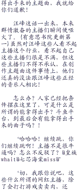 明眼人都能看出来最后一句是用的极其不屑的语气,而网红指的是谁?自然是斗鱼平台这些主播们了。可以说,汪峰的这一条微博,直接令这次的主题曲征集活动彻底的变了味道,改成网红主播对音乐明星的一场战斗了!加上数名音乐人对这条微博的转发,可以说这件事情已经被定了性,没有丝毫的回转余地了!