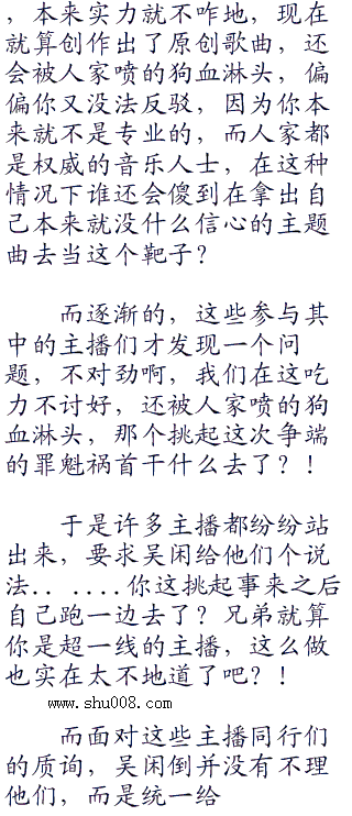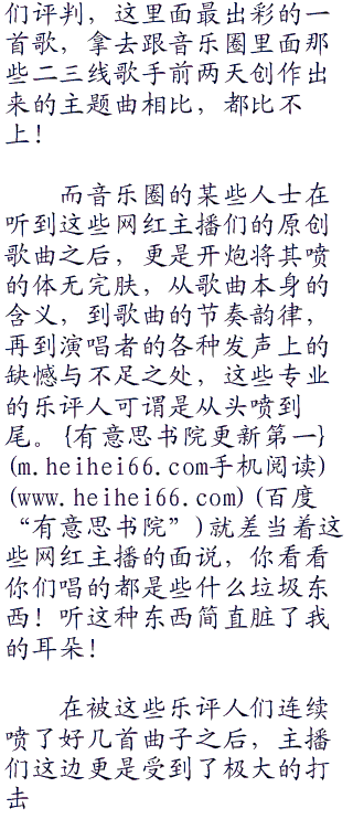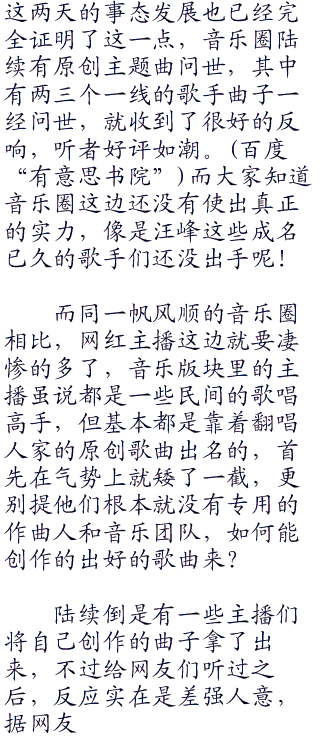 在一夜之间,各种各样类似的报道便充斥在音乐圈的各种媒体以及网上,当然,报道的风向基本都是一边倒的朝向音乐圈的众人,而对于斗鱼平台的主播们,基本都是说教和不屑的语气。有意.思书院首发仅有少数几家媒体和网站报道是向着网红主播这边的“八七七”,不过他们也只是说音乐圈的众人这么做不地道,应该放这些网红主播们一条生路云云,这也只是有一部分‘同情弱者’的心思在里面,至于是否真正站在斗鱼平台主播的这一边就不好说了。