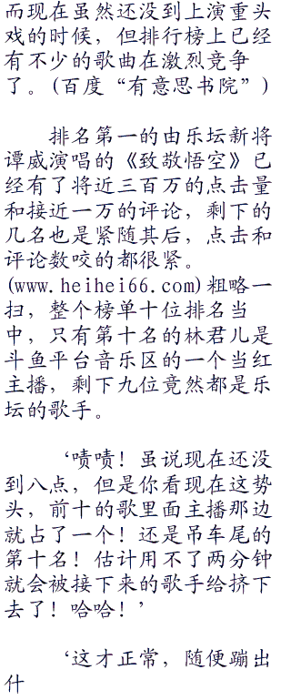 ‘兄弟啊,不要开玩笑了好不。<a href="hei." target="_blank">hei.</a>那些主播有几个是有真才实学的?音乐区都是一帮胸大无脑的萌妹子,还赢?别逗我了!’