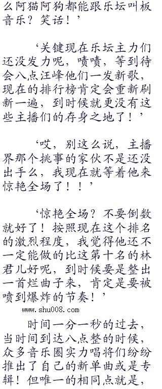 ‘是啊,跟音乐圈比音乐,真不知道这家伙是怎么想的!我可是听说那些乐评人们都卯足了劲在这等着呢!只要这家伙真的敢拿出首原创主题曲来,绝逼是要被喷到爆炸的节奏!3!’