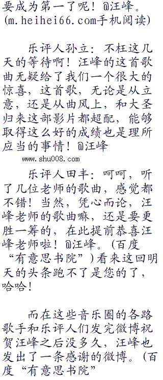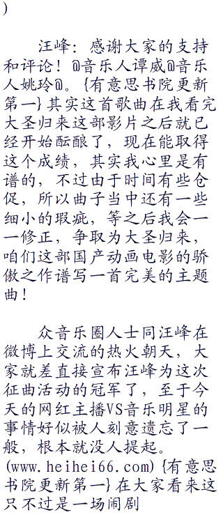 ‘我刚刚听了其它几首,确实都要比谭威的这个要好一些,不过这里面听起来最有感觉还是这首《石头》,别的那几首歌词什么的都不错,就是欠缺些灵魂,没有把大圣的精神给点出来,汪峰老师的这首石头就不错,重点点出了大圣那种坚韧,顽强的品格,赞一个!’