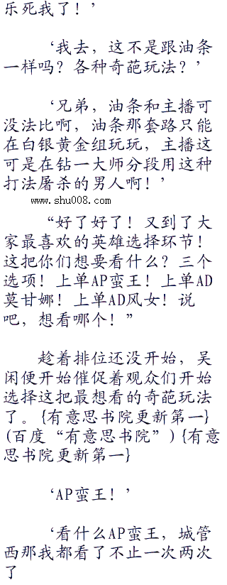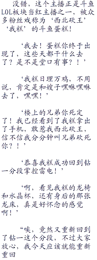 ‘问ID的兄弟这两天没看主播直播吧?我跟你们说,自从主播改了ID之后,尼玛画风变了我一脸,原来都是什么瑞文妖姬劫,二十分钟轻松超神屠杀结束战斗。结果现在什么AD石头人打野,奶妈ADC,AP狗头,我去!你是没看到,简直乐死我了,一开始主播选出来这些英雄,十把里面有九把队友会秒退掉,到后来偶尔才能碰上一把队友愿意和他试试。结果开打之后主播玩这些奇葩英雄还真的carry了,哈哈!当时看那帮钻一大师玩家的表现,简直