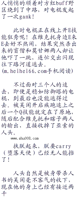 吴闲现在有疾跑有闪现,在他的盯守下,这蛮子是肯定难逃一死了。有意思.书院首发而蛋糕的瞎子现在R技能还没放,去追杀血量不健康的猴子应该也很容易收掉猴子的人头。