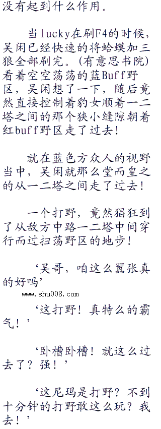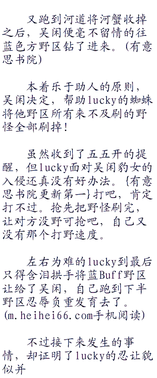 跟中路的小法师打了个招呼之后,吴闲便将自家刷新出来的蓝Buff收入了囊中。虽说从第二个蓝buff开始一般都会让给中路,小法师这英雄对蓝buff的需求也不小,但要是真的比较起来的话,还是吴闲的豹女拿蓝buff的收益更高一些。有意.思书院首发