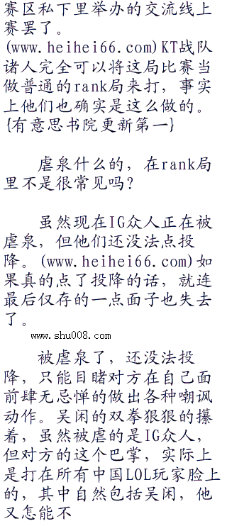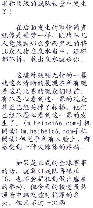 到了某一刻,吴闲停下了解说,看着屏幕中的画面,默然不语。那已经不能算是比试了,完全就是一场一边倒的屠杀,连三十分钟都不到,IG两路高地被破,KT五人组竟然直接将IG的残兵败将们追到泉水里,并且冲泉水强行杀掉了Ig的最后一人!