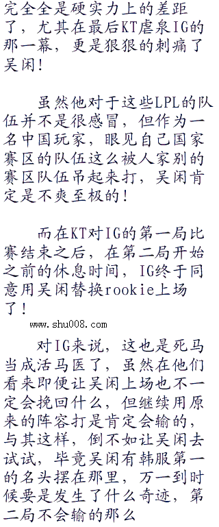 坦白讲,就算之前早就料到了LGD、IG可能会输,但也没有料想到他们竟然会输的这么惨。大概EDG上午的胜利给了吴闲一种错觉,那就是LPL的队伍实力也还可以,并不是不可救药的。但是现在想起来,论对韩战队的经验上,LGD和IG是肯定无法与EDG相比的,再加上KOO的实力算是SKT、KOO、KT三支战队中最弱的一个,而且就这样对方在第一局的时候还是用一种近乎戏谑的态度在玩。