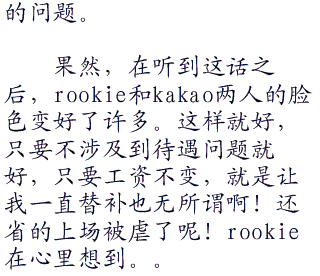 对于失败,kakao和rookie虽然心里也不是很舒服,但却能找到安慰自己的理由。我们反正来中国就是赚钱的,钱到手就好了,成绩什么的只要看得过去就好了,谁又会在乎这些问题呢?