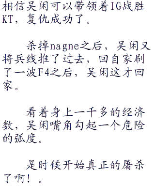 中路的兵线已经慢慢的从紫色方中路一塔下推了出来,nange看吴闲不在,于是给其它两路和打野的score发了个信号,随后便小心翼翼的靠近兵线,谨慎的补起兵来。首发