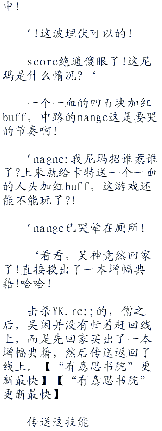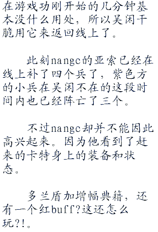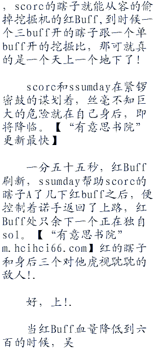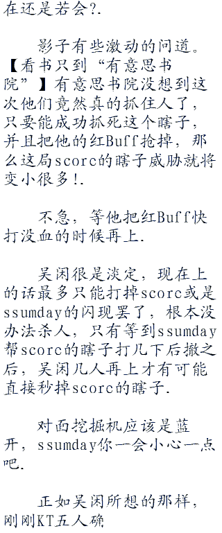 吴闲和ig几人在红buff旁边的草丛蹲了将近一分钟,都没有发现kt战队任何一人的痕迹。吴闲知道kt战队应该是和自己这边的选择一样,也去人浸自己家的红buff野区了。现在已经快要到了小兵上线的时间,小孩和射可可两人还是回