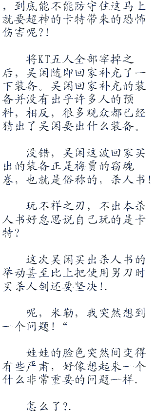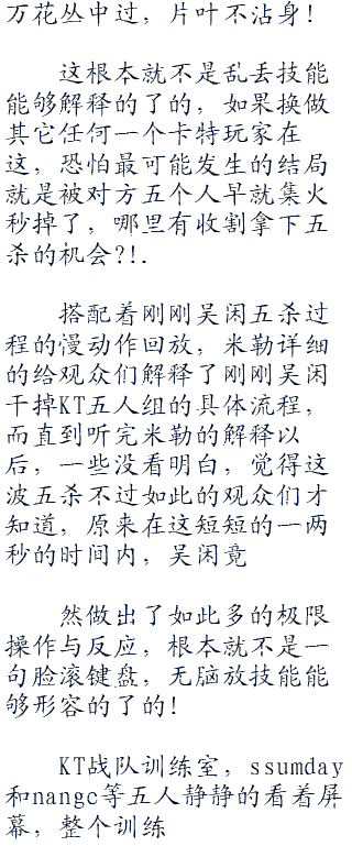 喷啧,七分钟被卡特拿了一个五杀,我感觉kt这把还是老老实实的泉水挂机吧,这个游戏太危险了,等到待会卡特爸爸起来了,那还不是跟上把最后那波一样,一两秒瞬间团灭的事?’.