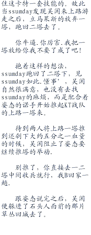 如此轻松加简单的一次越塔强杀,根本不费吹灰之力,kt下路双人组便被斩于马下。这和之前观众们所看到的那些职业比赛完全不同,在那些职业赛上,那次想要越塔强杀不是事先经过了精
