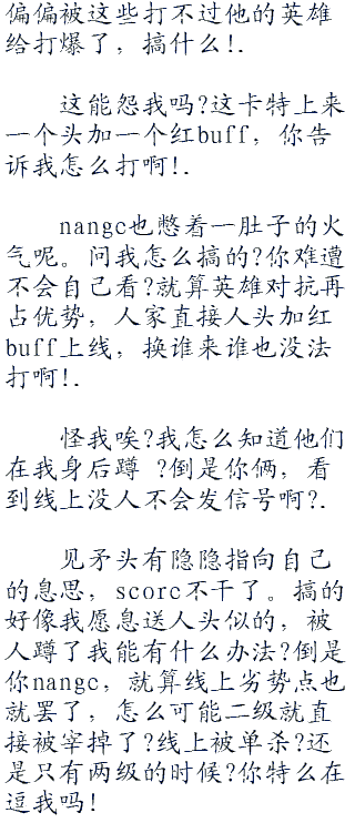 自己在线上打的挺好,甚至还占了些优势,结果中路的nange直接炸崩盘了,现在弄得自己在这个诺手面前畏手畏脚,就连补兵的勇气都没有了,这叫什么事啊!