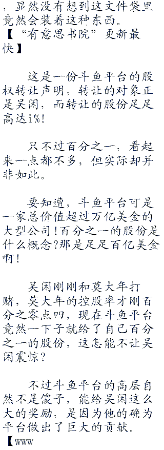 刚刚叶钱说这个文件夹里是斗鱼平台高层一直决定给吴闲的礼物,看叶锋那郑重的表情,吴闲便知道这一定是一份十分贵重的礼物。但是偏偏叶锋却不让他当场打开,而是让吴闲回去再慢慢看。