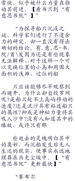 “在大西洋中,有一个小小的岛屿一赛布尔岛,被世人称之为.沉船墓地,,因为经过此地,触及岛屿周围浅滩的船只,均神秘沉没,难寻踪迹,沉没原因成为未解之谜,令人们困惑不已