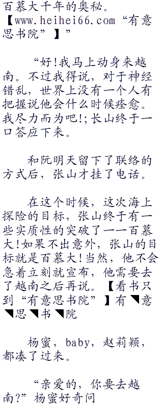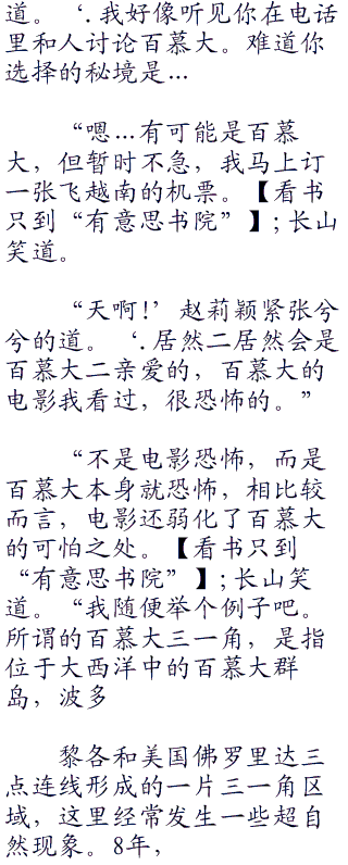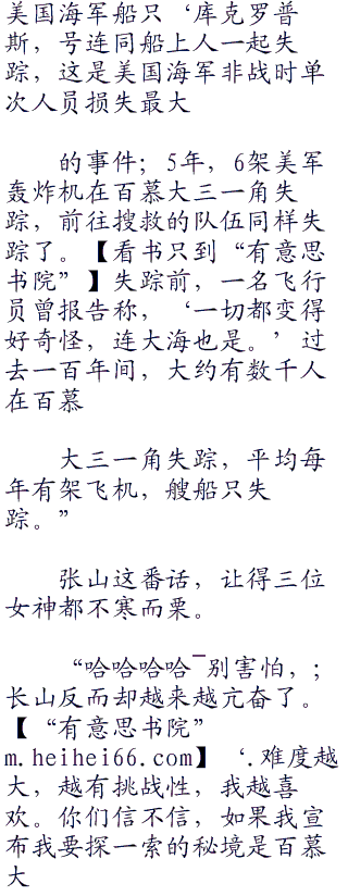 张山下意识的脱口而出道。‘.作为一个探险者来说,百慕大的确对我充满了致命的诱一惑。在近年来,科学家们关于百慕大的所有理论研究,都已经被推翻了。如果能够找到一个目击者