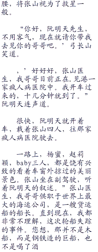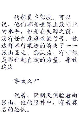 无法想象的,恐怖的,神秘的事情,这才导致他精神失常。据说百慕大,有着近乎超自然的现象。或许二或许您在治好我哥哥后,可以从他那里,得到您想要的绝密资料!”