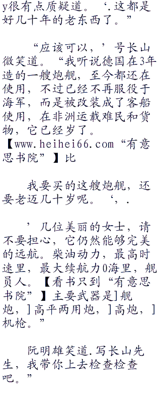“张山先生,舅舅说,他愿意将那艘旧炮舰出售给你,不过,价格是4万欧元,您的看法呢?’.阮明雄在张山身边汇报道。