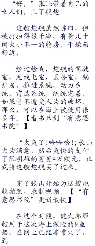 “没问题,我相信你的推荐。;长山笑道。“不过,出发的时候,你替我再找几名出色的水手,我会照付薪水的。对了,需要胆子大一点,不畏俱百慕大的。‘,