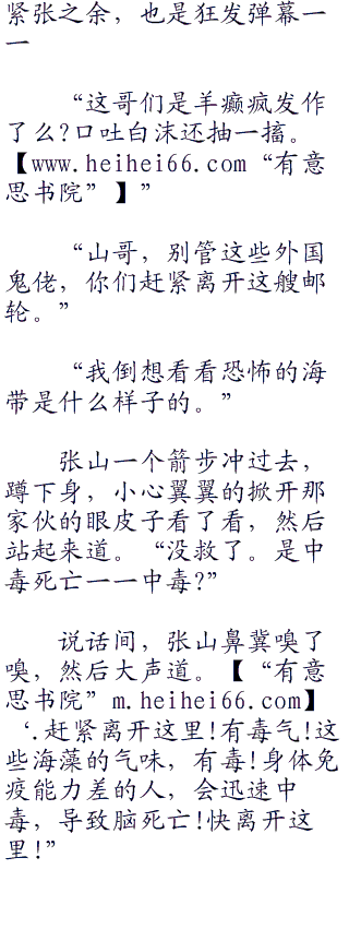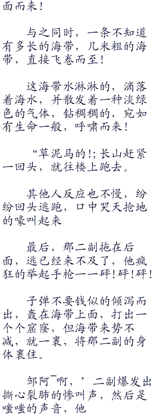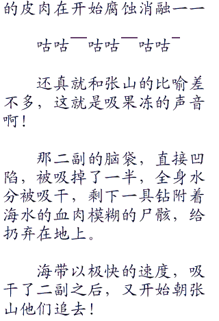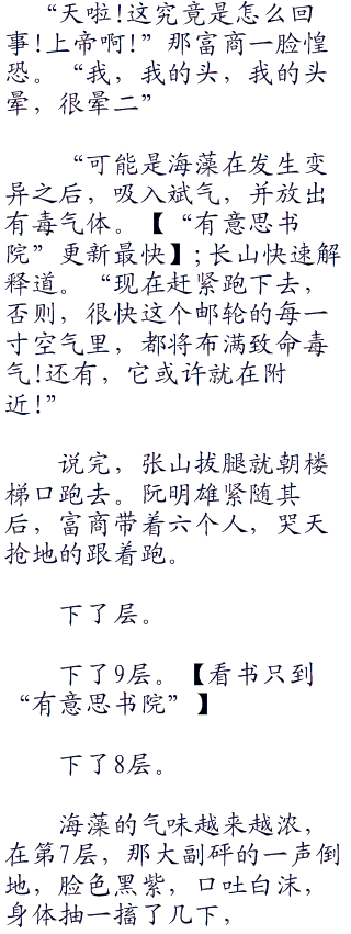 “根据我的分析,应该是变异的海藻类植物。它有可能杀人,不,不是有可能,而是肯定会杀人。;长山快速说道。‘.我们在电梯里,已经看到一个遇难者了。‘,