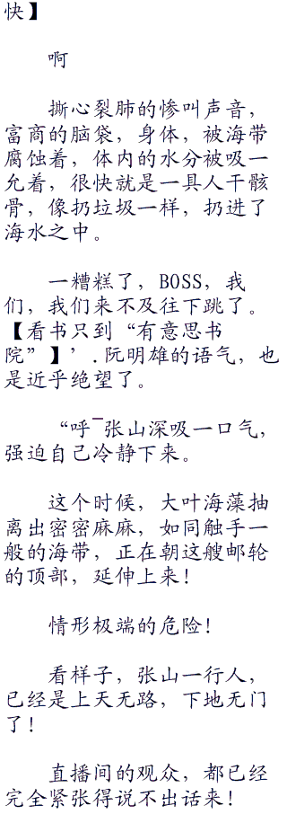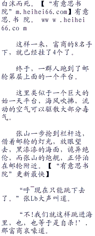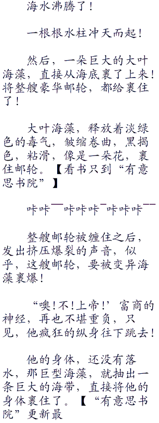 在逃亡的过程中,邮轮摆动的幅度越来越邃烈,有毒腥臭的气味,追击着张山他们,并且迅速在整个邮轮中扩散开来。