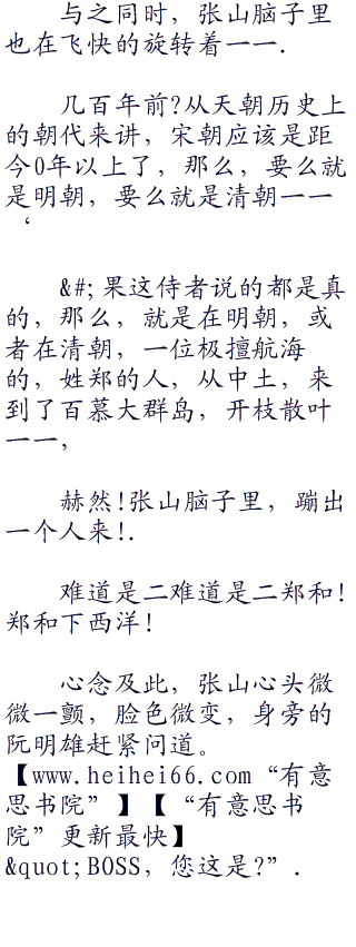 这似乎是不太可能的事情,而且历史上根本就没有这样的记载。当然,张山也并不是尽信历史的人,可对于侍者所说的,的确是找不到丝毫线索,无迹可寻啊!