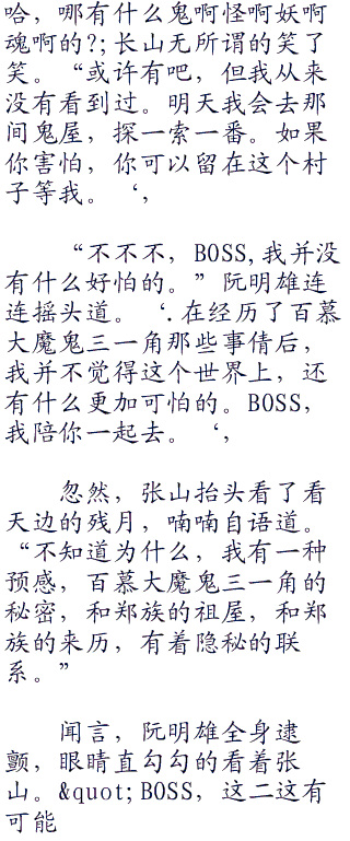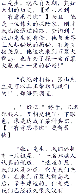 很显然,张山现在对这一支流落到百慕大群岛的天朝郑族人,燃起了熊熊好奇心,并将他们,与明朝时期的伟大航海家,郑和,,联系了起来。百度