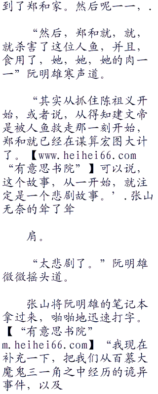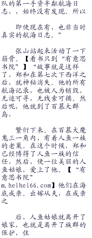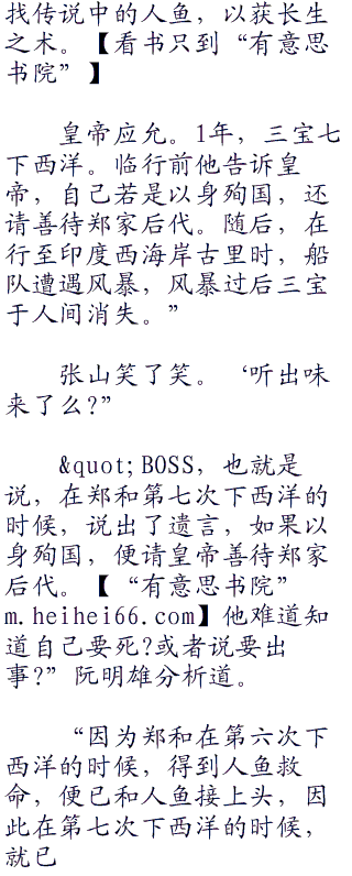 ,口果我没有猜错,郑和在印度海域捉到的那只落单的人鱼,就是后来,郑和的妻子。;长山微微点头道。‘.姻缘,应该就是在第三次下西洋的时候,种下的。”