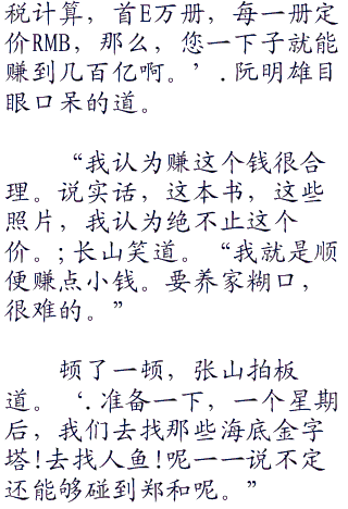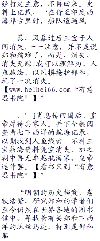 “同样是一本野史上记载,十几天后,三宝又一次受命二下西洋。临行前,皇帝对三宝委婉表达了寻找人鱼之事,三宝愁云满面的点了头。9年,在外佯装围捕人鱼两年后,三宝回国