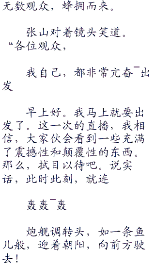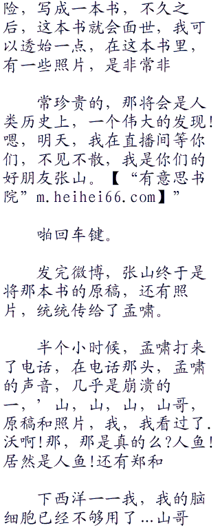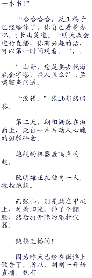 在这种美景之下,张山可以随意的遨游,这一刻,他就真感觉到,自己是一只欢快的鱼儿。