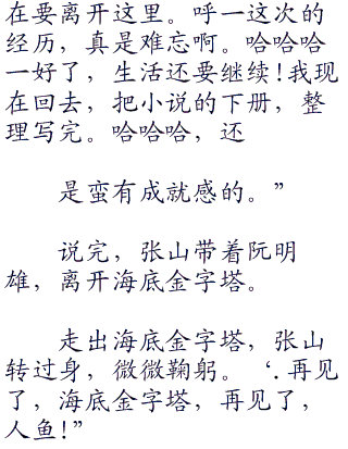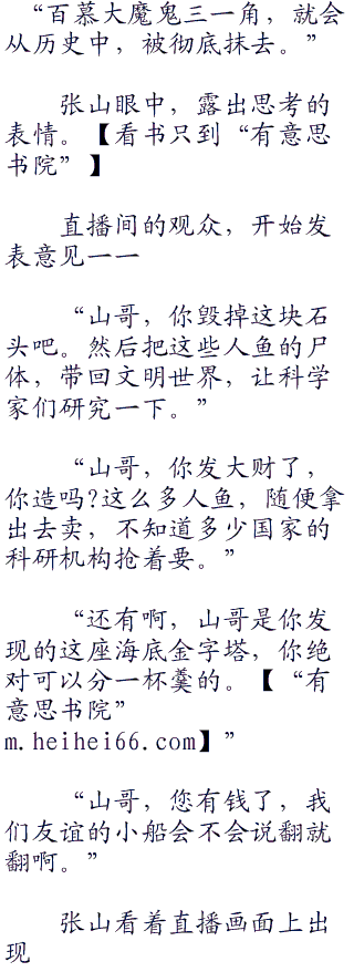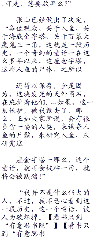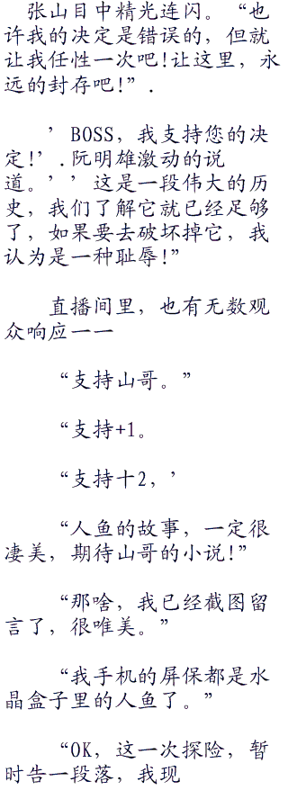 “这是很正常的自然现象。’写长山耸了耸肩,然后对着镜头道。‘.各位观众,大家所看到的人鱼,这一个梦幻魔幻奇幻的族群,已经灭亡了。好了,我继续带着大家,在这座海底金字塔转
