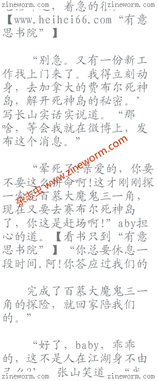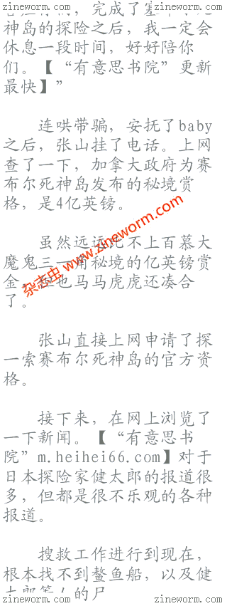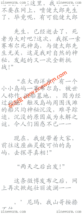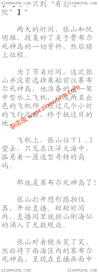 “好了,你可以跟我一起过去。我会抓紧时间,搜集有关赛布尔死神岛的一切资料,争取在两天之后动身吧。’写长山站了起来。