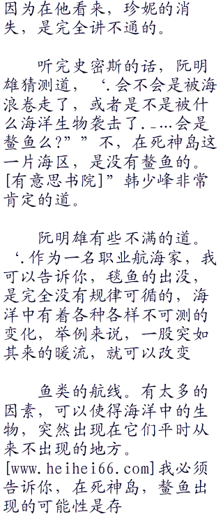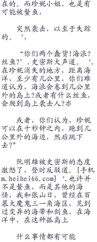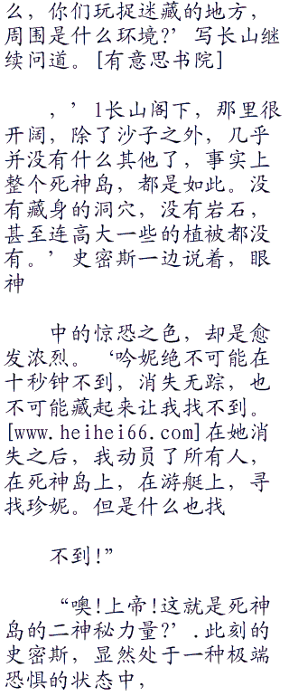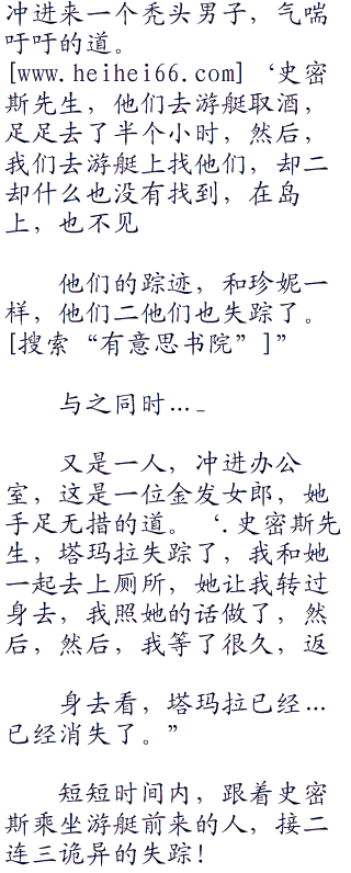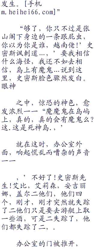 史密斯用颤一抖的手,从怀中取出一壶酒,猛烈灌了一口,然后惊恐的道。“我自然非常乐意这样做,于是我转身,我数到了十一一就在我再转身,想要扑上去,抱住珍妮的时候,我发现