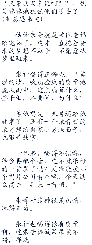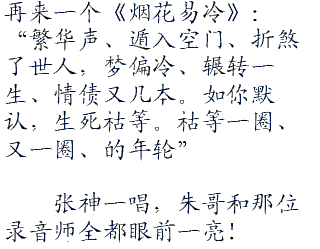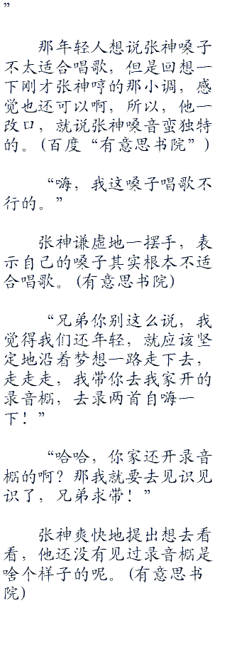 那个年轻人还看着张神呢,张神胡扯到:“哦,这是我一个朋友写给我的,没想到这首歌居然没有发布。”