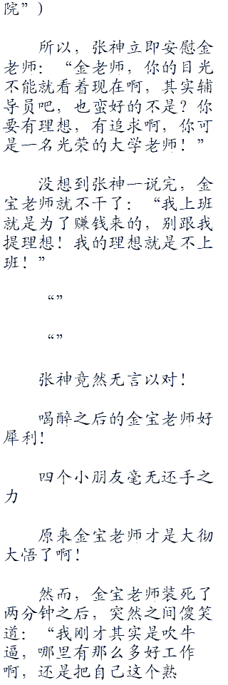 “喂,金宝老师吗?我是张神啊,你晚饭吃了没啊?金老师我们来教师餐厅跟你一块吃顿饭啊。”
