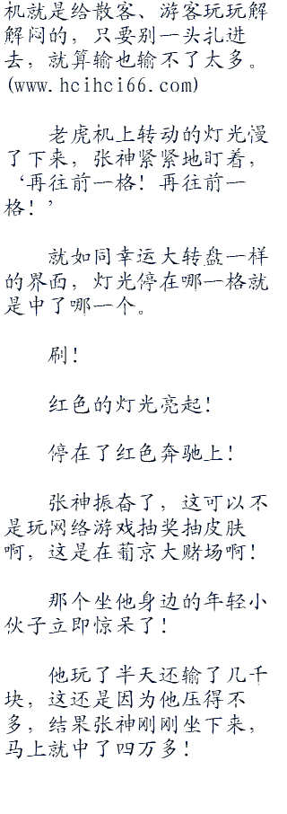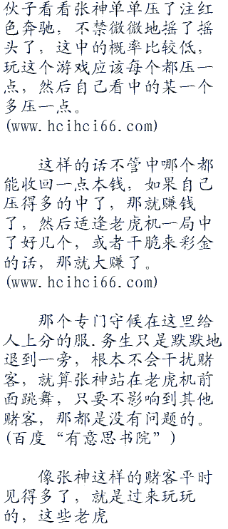 “不过,咱们面前的这种老虎机就不同了,你们看到没有?这边八台是联机的,可以供八个人同时押注,然后才开奖,中奖的概率也不会调到很低,其实是很好玩的。”