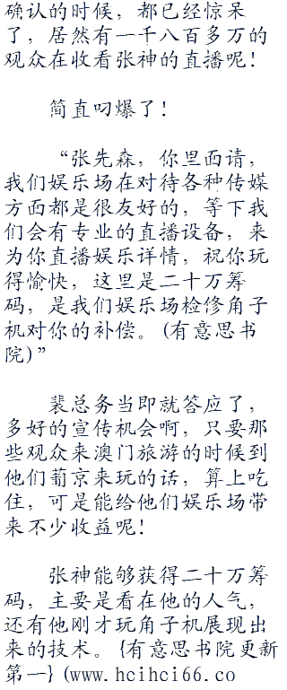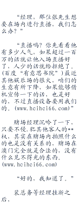 “裴总务,其实是这样的,我是斗鱼直播平台的一名主播,我来葡京娱乐场是为了带观众们领略这里的风采,之所以玩角子机,那是因为只有这边是不限制使用手机拍照的,我想问问,我可不可以在你们赌场内直播?”