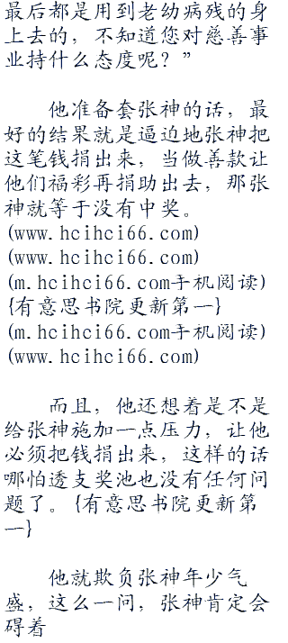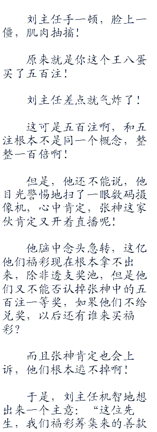 “啊?哦,找我啊?双色球吗?中奖金额啊”福彩主任被惊醒,语言错乱的答了两句,他听到有人来兑奖,脸色更加苍白了,“兑奖的人来了吗?我去看看”