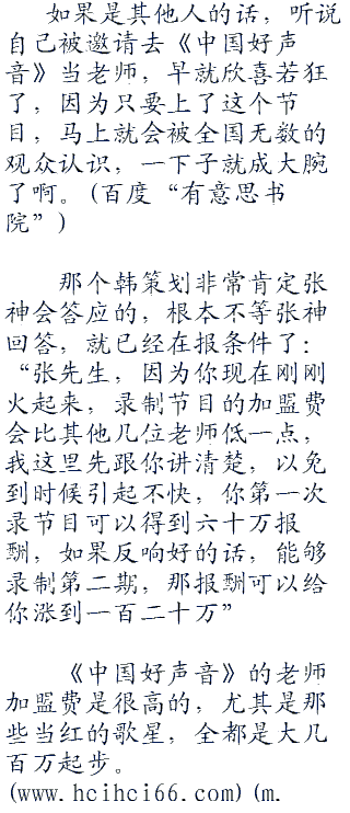 《中国好声音》这档节目推出的时候就大火,有好多新人歌手在舞台上一曲成名,造就了大批的歌星,张神怎么会不知道呢?