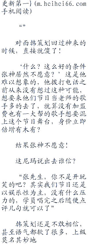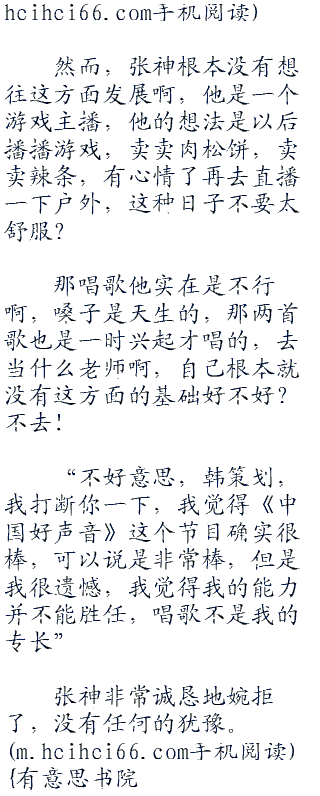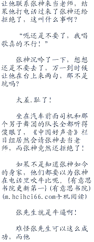 “我是《中国好声音》的节目策划,我姓韩,张先生你的两首单曲此时雄踞音乐新曲榜前二的位置,据传这两首歌也是你自己写的,我们节目组希望你能来参加我们下一期节目的录制,当老师指导学员,到时候有”