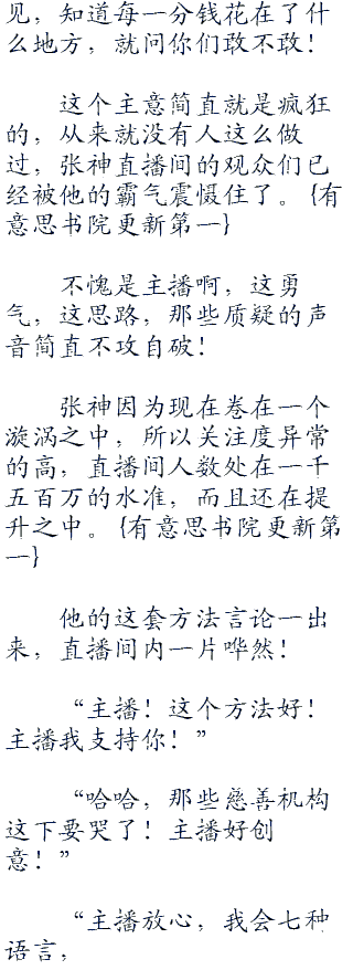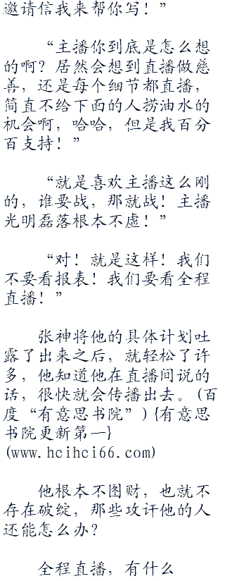 停顿了一下,张神吐露了他一个想过很久的主意:“大家可能都很期待如何监督资金的流向吧?我觉得一张报表并不能说明什么,只要一个高明的会计师,就能够把报表做得很好看!主播想说的是,财务报表根本就没有鸟用!主播有一个想法,我成立的慈善机构,所有行动全都在斗鱼直播平台直播,包括吃饭!接受来自全国观众的监督!”