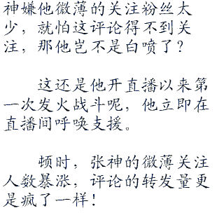 张神在直播间正大光明地打开了卫刚的微薄,微博上很装逼地发了一条消息:今天看到某个知名主播双色球中了亿之后借口搞慈善试图避税漏税,从而达到自由挥霍的目的,我感到很气愤,导致心态不平和,发挥失常输掉了比赛,对不起!